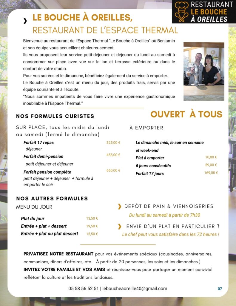 À l’Espace Thermal à Dax dans le Sud des Landes, le Restaurant de l’Espace Thermal vous accueille afin de vous faire découvrir toutes les saveurs de sa région.Trait d’union incontestable entre les bienfaits de la cure thermale et le charme de la résidence.